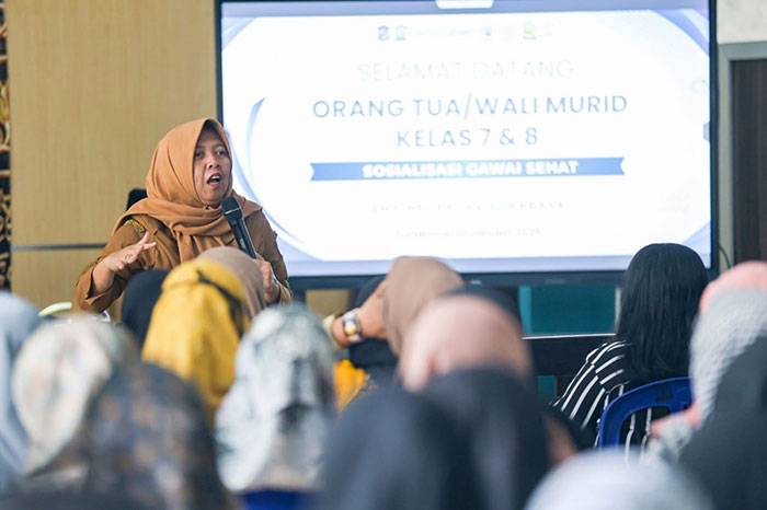 Kepala Dispendik Kota Surabaya, Febrina Kusumawati menjelaskan sosialisasi terus digulirkan pada seluruh sekolah SD-SMP se-Kota Surabaya, dengan tujuan agar orang tua mendengarkan secara langsung teknis pembatasan penggunaan gawai terhadap anak.