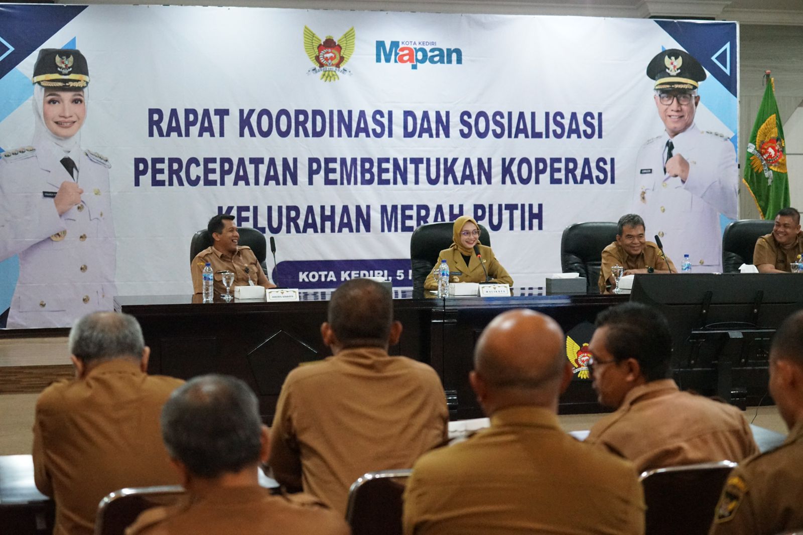 Pembentukan Koperasi Desa/Kelurahan Merah Putih diawali Wali Kota Kediri, Vinanda Prameswati dengan Rapat Koordinasi dan Sosialisasi Percepatan Pembentukan Koperasi Kelurahan, Senin (05/05) di Ruang Joyoboyo.