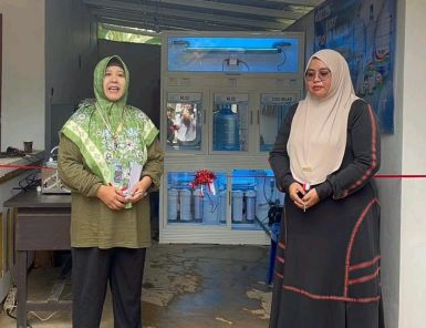Peresmian depo air minum berteknologi Reverse Osmosis oleh dosen pembimbing, Farida Hardaningrum SSi MT dan kepala desa Batangbatang Daya, Siti Naisa SSos.