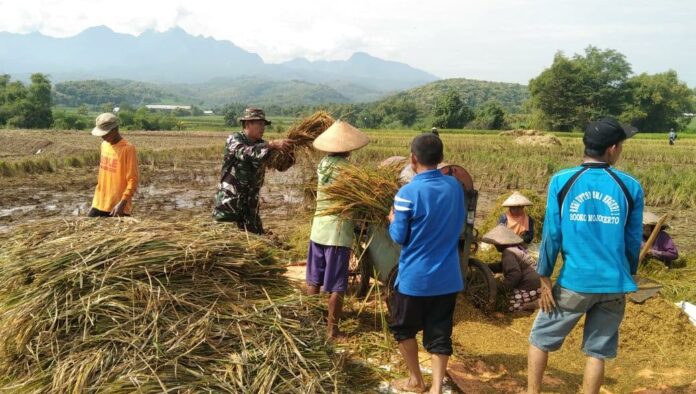 Babinsa Baureno saat melakukan pendampingan panen padi.