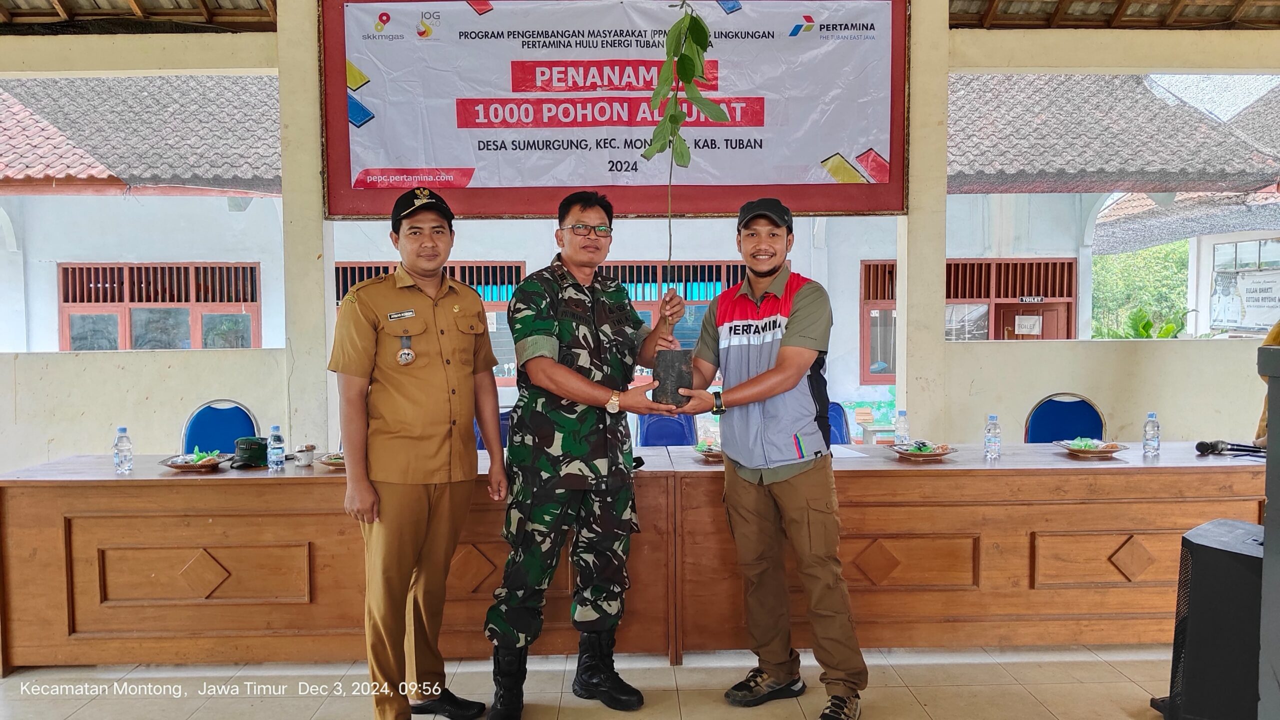 Tim dari Pertamina Hulu Energi Tuban East Java (PHE TEJ) Zona 11 Regional Indonesia Timur saat menyerahkan bibit pohon alpukat secara simbolis pada anggota TNI dan Kepala Desa setempat.