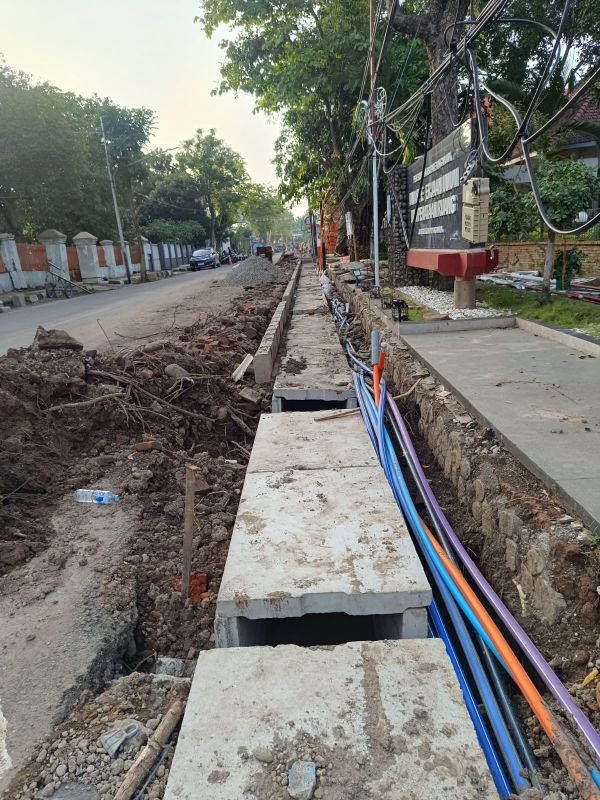 Galian kabel fiber optik, pipa PDAM, dan jaringan listrik bawah tanah ditanam dengan presisi di tengah efisiensi anggaran di Kabupaten Nganjuk, kemarin.