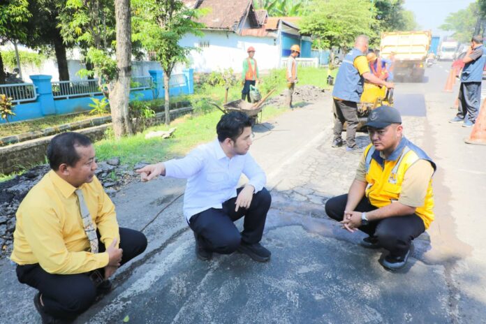 Wakil Gubernur Jawa Timur Emil Elestianto Dardak meninjau langsung proses perbaikan ruas jalan provinsi Kejayan–Purwosari, Kabupaten Pasuruan, Rabu (15/4). Ia menekankan agar perbaikan dilakukan dengan standar kualitas tinggi, bukan sekadar tambal sulam yang tidak awet.