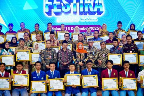 Gubernur Jawa Timur Khofifah Indar Parawansa memberikan apresiasi dan penghargaan kepada guru dan murid berprestasi dalam ajang Festival Teknologi Informasi dan Komunikasi (Festika) Jawa Timur Tahun 2025 yang digelar di Hotel Savana, Kota Malang, Senin (15/12).