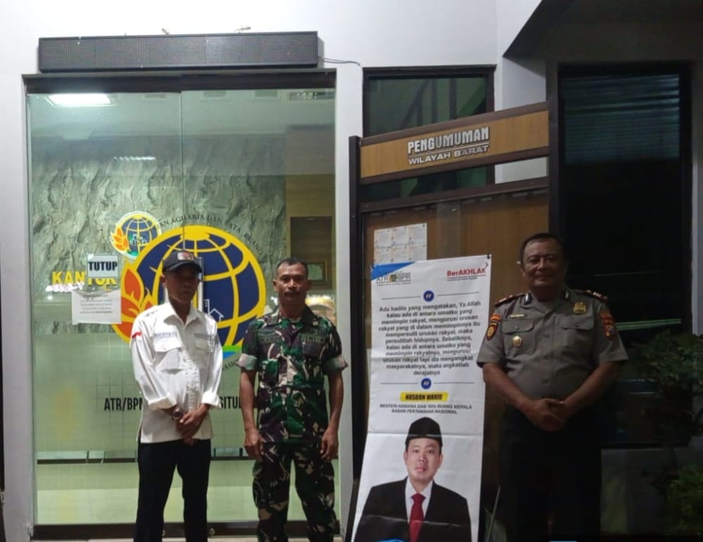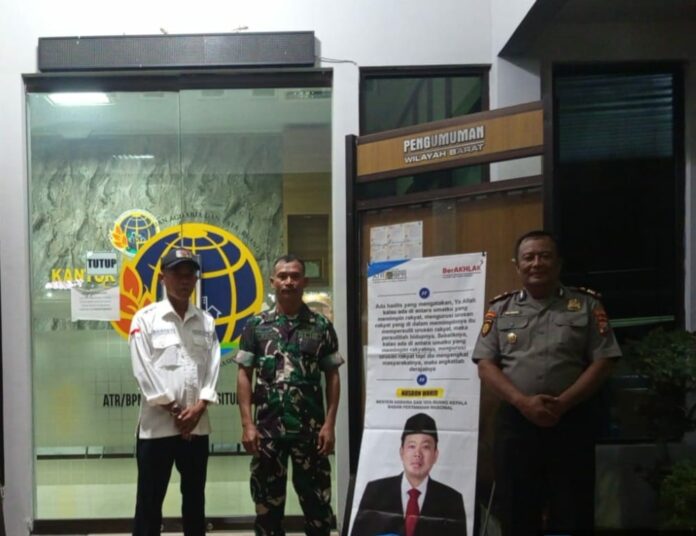 Jajaran Forkopimca Mangaran mendukung kebijakan Kementerian ATR/BPN dengan memasang banner himbauan pelayanan religius di Kantor ATR/BPN Situbondo, Selasa malam (16/12). sawawi/bhirawa