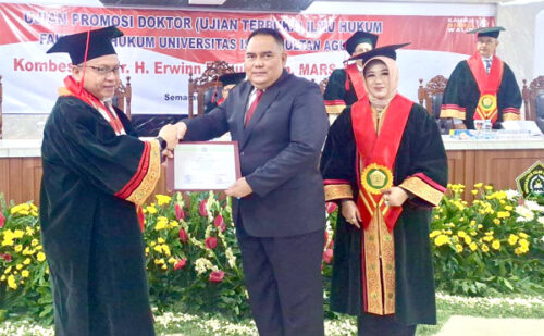 Kombes Pol Dr. Erwin Zainul Hakim M.A.R.S, MH.Kes berhasil meraih prestasi akademik di bidang hukum kesehatan. Atas capaian itu, Kombes Pol Erwin resmi menyandang gelar doktor Ilmu Hukum dari Universitas Islam Sultan Agung (Unissula) Semarang.