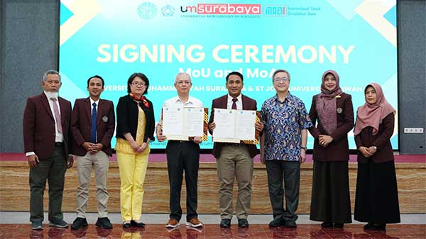 Universitas Muhammadiyah Surabaya (UM Surabaya) menjalin kerjasama strategis dengan St. John’s University, Taiwan. Ditandai dengan penandatanganan Memorandum of Understanding (MoU) dan Memorandum of Agreement (MoA) kerjasama ini akan berfokus dalam program 3+1 Double Degree, yang memungkinkan mahasiswa menempuh tiga tahun studi di UM Surabaya dan satu tahun di St. John’s University dengan dukungan beasiswa penuh.