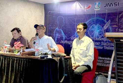 Jaringan Media Siber Indonesia (JMSI) Provinsi Jatim menggelar Focus Group Discussion (FGD) tentang “AI dan Masa Depan Kebenaran Tantangan Baru Jurnalisme Modern” dilanjutkan Musyawarah Daerah (Musda) di CrownPrince Hotel Surabaya, Kamis (27/11/2025).