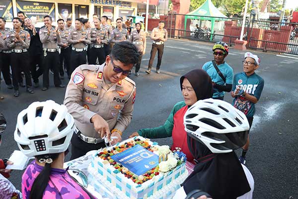 Keakraban semakin terasa ketika komunitas Minitrek memberikan kejutan berupa kue ulang tahun untuk Satlantas Polres Mojokerto Kota. Dengan penuh canda dan kehangatan, potongan kue pertama diberikan langsung oleh AKP Galih Yasir Mubaroq kepada Ketua Minitrek, Fadoli. Momen itu disambut tepuk tangan dan sorak bahagia seluruh peserta.