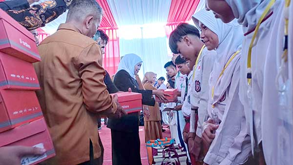 Dalam kesempatan ini, Khofifah menyerahkan bantuan sosial senilai Rp2,23 miliar berupa 100 pasang sepatu dan 100 perlengkapan sekolah untuk siswa SR.