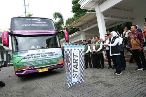 Gubernur Jawa Timur Khofifah Indar Parawansa secara resmi melepas 16 Kepala Keluarga (KK) calon transmigran asal Jawa Timur yang akan diberangkatkan ke Kabupaten Sidenreng Rappang (Sulawesi Selatan), Kabupaten Polewali Mandar (Sulawesi Barat), dan Kabupaten Halmahera Tengah (Maluku Utara), Selasa (2025).