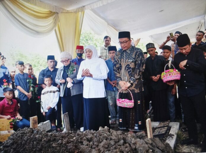 Gubernur Jatim Khofifah Indar Parawansa saat takziah sekaligus mengiringi pemakaman atlet gimnastik artistik putra Naufal Takdir Al Bari di Tempat Pemakaman Umum (TPU) Tlogopojok, Gresik, Jumat (3/10).