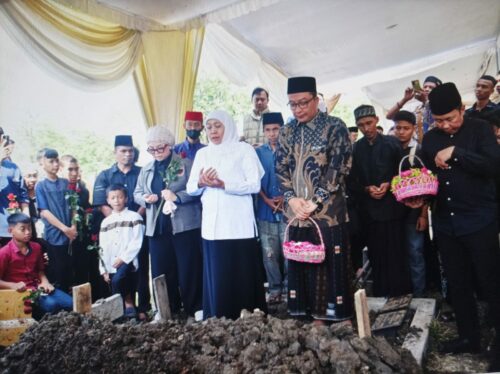 Gubernur Jawa Timur (Jatim) Khofifah Indar Parawansa menghadiri takziah sekaligus mengiringi pemakaman atlet gimnastik artistik putra Naufal Takdir Al Bari di Tempat Pemakaman Umum (TPU) Tlogopojok, Gresik, Jumat.