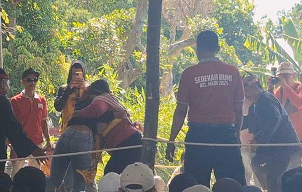 Tradisi budaya sedekah bumi atau tegal deso masih lekat di Kelurahan Made, Kecamatan Sambikerep, Surabaya, Minggu (28/9). Kemeriahan budaya ini semakin terasa, manakala diadakan tradisi gulat okol pria dan wanita yang digelar oleh warga Kelurahan Made pasca panen padi setiap tahunya.