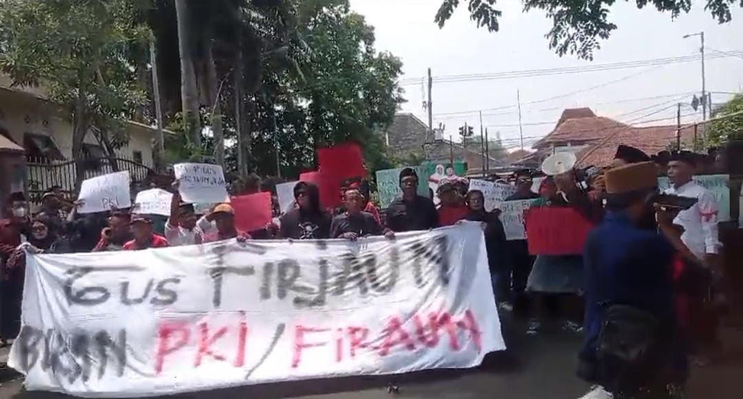 Dalam aksi tersebut, massa membentangkan spanduk bertuliskan “Gus Firjaun bukan PKI/Firaun”, menegaskan dukungan mereka terhadap Gus Firjaun.