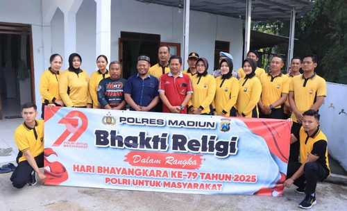 Menyambut Hari Bhayangkara ke-79 tahun 2025, Polres Madiun bersama Polsek jajaran menggelar Bhakti Religi serentak di sejumlah tempat ibadah yang tersebar di wilayah Kabupaten Madiun, sebagai bentuk kepedulian sosial dan penguatan sinergi dengan tokoh agama dan masyarakat, Kamis (12/6).