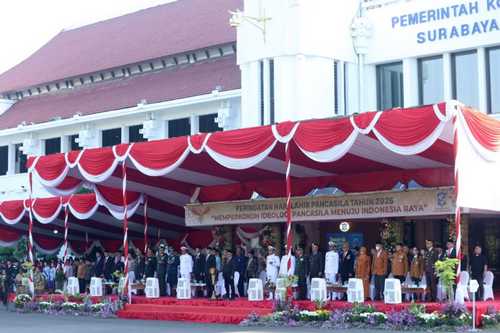 Pemerintah Kota (Pemkot) Surabaya menggelar upacara peringatan Hari Lahir Pancasila, di Halaman Balai Kota – Taman Surya, Senin (2/6/2025).