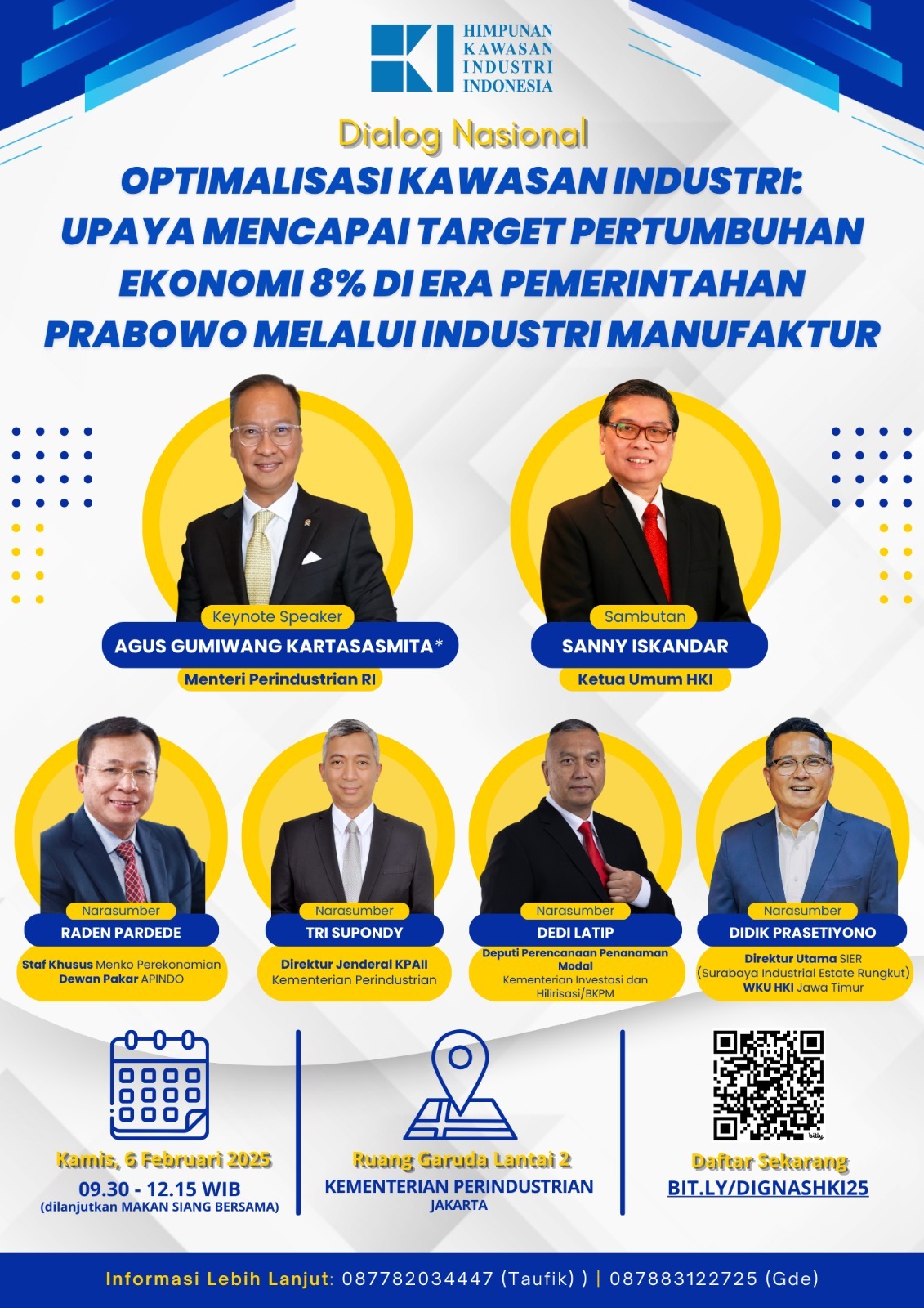 Himpunan Kawasan Industri (HKI) Indonesia bakal menyelenggarakan Dialog Nasional bertajuk ‘Optimalisasi Kawasan Industri: Upaya Mencapai Target Pertumbuhan Ekonomi 8 Persen di Era Pemerintahan Prabowo melalui Industri Manufaktur’.