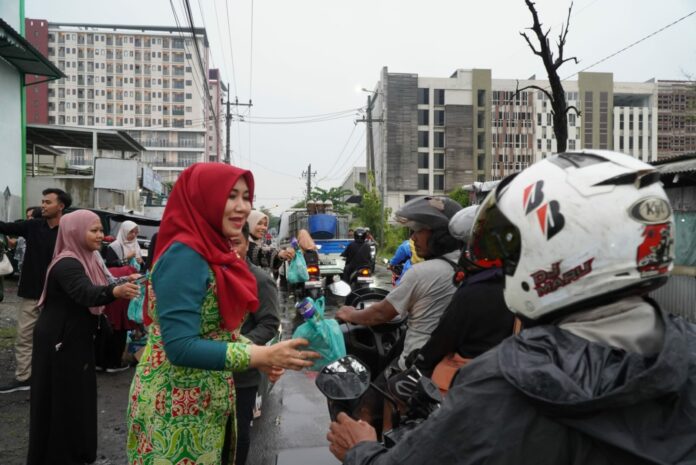 Neng Lia sapaan akrabnya, sekitar pukul 17.00 WIB, meski kondisi jalan basah dan gerimis, tetap menyapa masyarakat satu per satu dengan ramah, sambil berbagi takjil. Dengan senyum hangat, mengingatkan pengendara untuk tetap berhati-hati selama perjalanan.