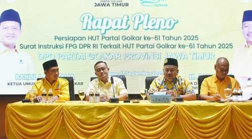 Menyambut HUT ke-61, Partai Golkar Jatim menggelar rapat pleno yang dipimpin Ketua DPD Partai Golkar Jatim, Dr KH Ali Mufthi, Rabu (18/9/2025) malam. Selain membahas soal dinamika kebangsaan terkini, rapat juga membahas persiapan HUT ke-61 Partai Golkar.