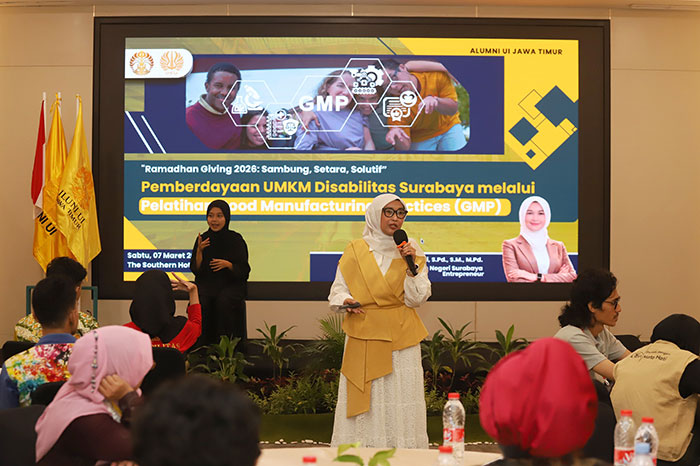 Kegiatan tersebut bertema ‘Ramadhan Giving ILUNI UI Jawa Timur 2026 : Pemberdayaan UMKM Disabilitas Surabaya’, melalui Pelatihan Good Manufacturing Practices (GMP) yang di ikuti oleh 25 UMKM yang berasal dari Surabaya, Sidoarjo, dan Kediri, Sabtu (7/3).