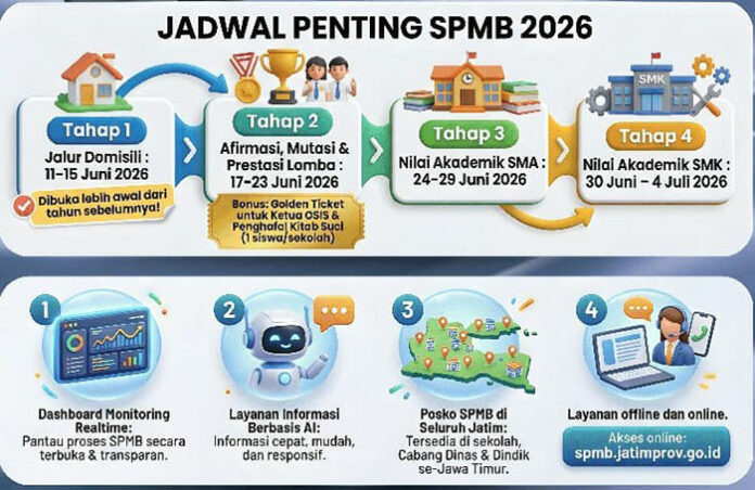 Dinas Pendidikan (Dindik) Jawa Timur mempercepat sosialisasi pelaksanaan Sistem Penerimaan Murid Baru (SPMB) 2026 di Jawa Timur agar masyarakat bisa memperoleh informasi sebanyak-banyaknya. Salah satunya penggunaan nilai Tes Kemampuan Akademik (TKA) sebagai tambahan penilaian dalam SPMB 2026.