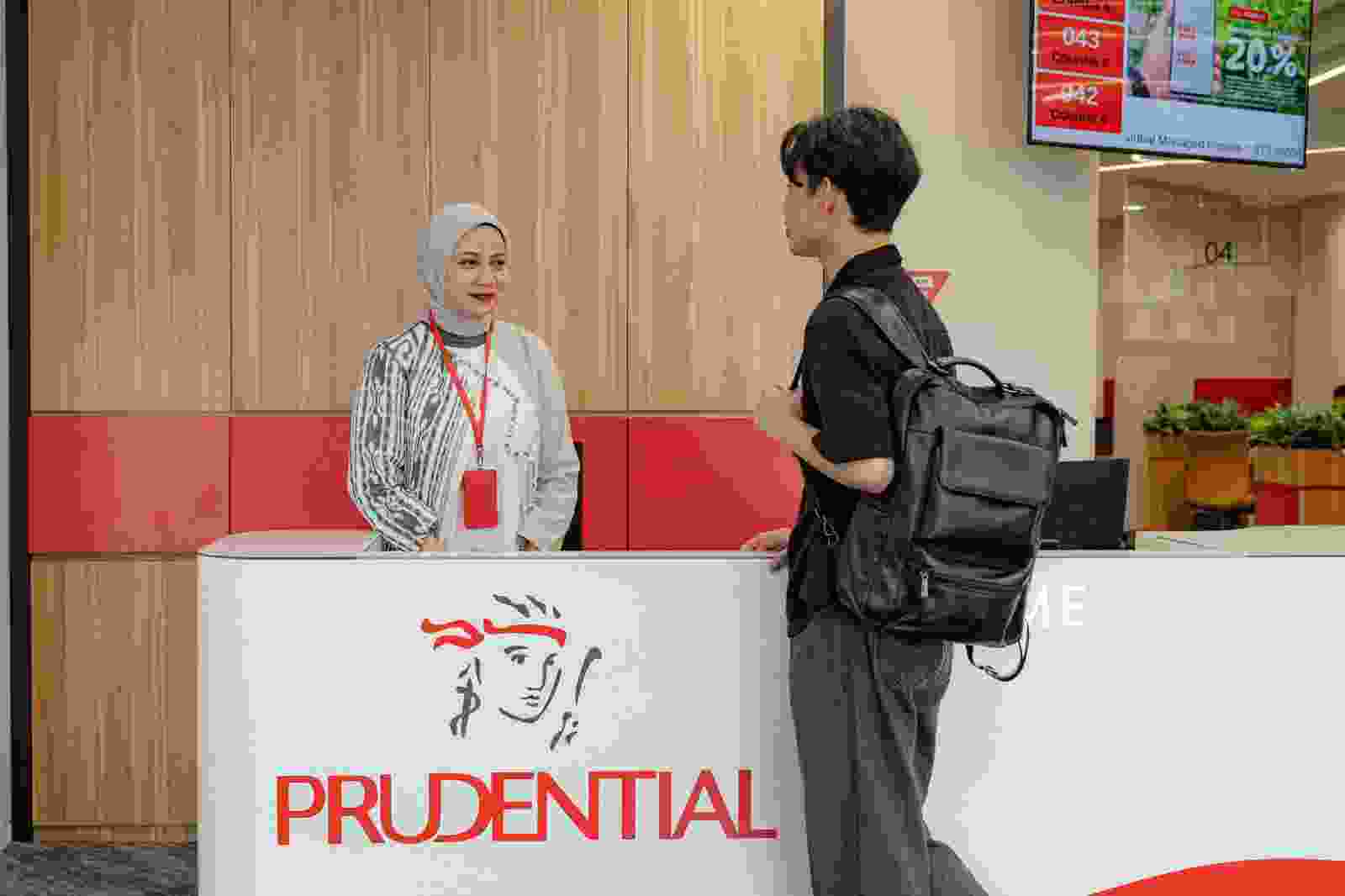 Petugas layanan melayani nasabah yang datang berkonsultasi di kantor Prudential Indonesia.
