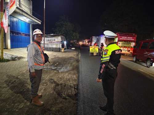 Selain mengurai potensi macet, keberadaan petugas berseragam ini juga berfungsi sebagai peringatan dini bagi pengendara agar mengurangi kecepatan. Hal ini sangat penting untuk meminimalisir risiko kecelakaan, mengingat adanya material jalan dan alat berat yang beroperasi di sekitar lokasi pada malam hari.