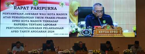 DPRD Kota Madiun menggelar rapat paripurna dengan agenda Jawaban Wali Kota Madiun Atas Pemandangan Umum (PA) Fraksi-Fraksi DPRD Kota Madiun dalam membahas Raperda tentang Pertanggungjawabam Pelaksanaan APBD Tahun Anggaran (TA) 2024 yang dipimpin Ketua DPRD Kota Madiun, H. Armaya di gedung DPRD setempat, Jumat (23/5/2025) sore.