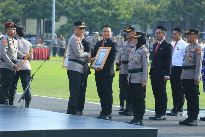 Kapolda Jatim, Komjen Pol Imam Sugianto memberikan penghargaan jajaran dan masyarakat berperan menjaga situasi kamtibmas, Senin (17/2) di Lapangan Apel Mapolda Jatim.