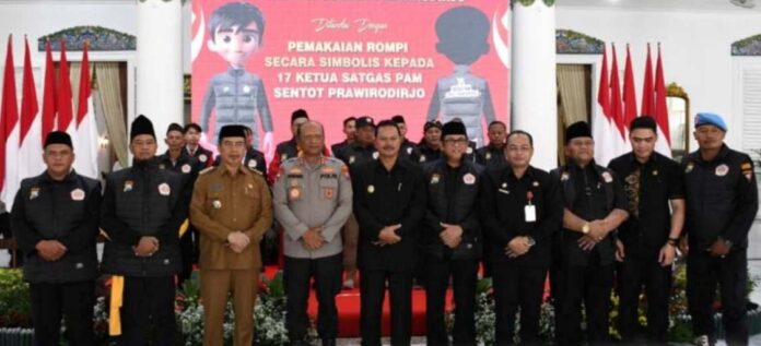 Kapolda Jatim,Irjen Pol.Drs Nanang Avianto,M.Si memakaikan rompi, secara simbolis kepada 14 ketua satgas PAM Sentot Prawirodirdjo yang akan bertugas menjaga stabilitas selama perayaan tradisi 1 Suro tahun 2025, Selasa (27/5) dilanjut foto bersama. foto: sudarno/bhirawa