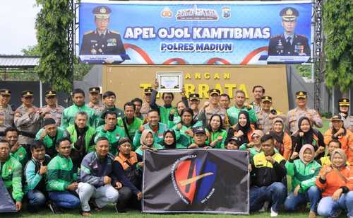 Polres Madiun menggelar Apel Ojol Kamtibmas di Lapangan Tri Brata Polres Madiun, Jumat (24/10). Apel dipimpin Kapolres Madiun, AKBP Kemas Indra Natanegara SH SIK Msi sekaligus memberikan piagam penghargaan kepada Paguyuban Ojek Online Ojol) Kabupaten Madiun.