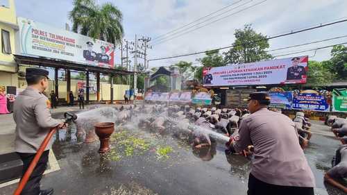 Sebanyak 83 polisi Polres Tulungagung, termasuk satu PNS, memperoleh kenaikan pangkat satu tingkat lebih tinggi. Menandai kenaikan pangkat tersebut, mereka semua menjalani tradisi unik dengan mandi kembang dan disemprot air oleh mobil pemadan kebakaran Dinas Pemadam Kebakaran Kabupaten Tulungagung, Senin (30/.6).