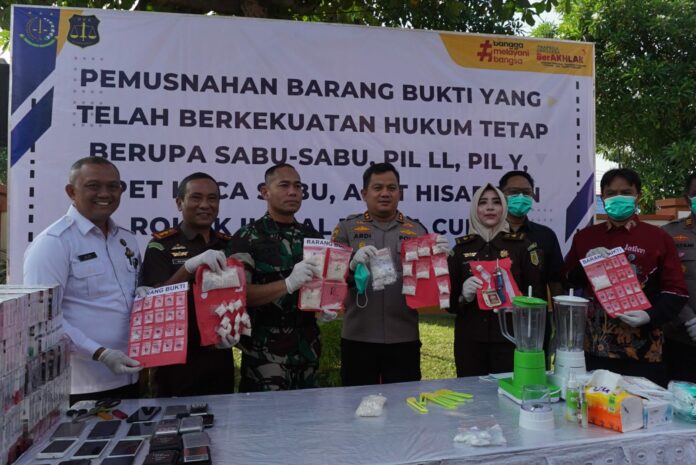 Barang bukti yang dimusnahkan antara lain, narkotika jenis sabu seberat 610,5 gram dari 54 perkara, pil double L sebanyak 613 butir dari 24 perkara, rokok tanpa pita cukai dari berbagai merek sebanyak 1.400 slop dari 45 perkara, ratusan botol minuman keras berbagai jenis seperti Anggur Hijau, Toak, dan Arak, sejumlah alat hisap sabu, pipet kaca, dan pil terlarang jenis Yarindu.