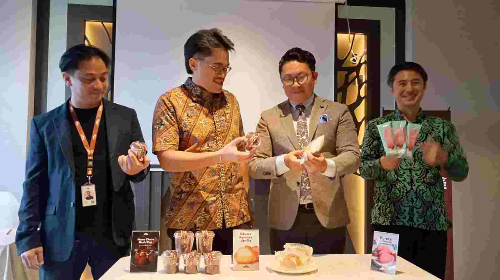 Claudy Leonardi Sales & Operation Manager Chateraise bersama Michael Johan Kanter, President Director Chateraise Gobel Indonesia dan Watanabe Vice President Chateraise Gobel Indonesia serta Hirai, Chateraise Japan Business Representatif saat media day di Surabaya, Jawa Timur pada, Rabu (25/2). Achmad tauriq/bhirawa
