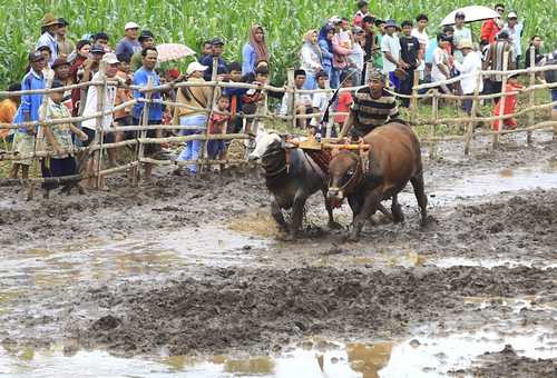 Suasana arena berlangsung semarak. Ratusan warga rela berdesakan di tepi lintasan, bahkan harus menginjak lumpur, demi menyaksikan langsung duel dua pasang sapi yang berpacu menuju garis akhir. Setiap pasangan yang berhasil finis lebih dulu disambut tepuk tangan dan sorak sorai penonton.