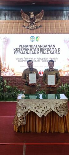 Usai sambutannya sebagai perkenalannya, Edy Purwoto bersama Trihandy Cahyo Saputro, menandatangani nokta kerjasama daerah antara Kabupaten Nganjuk dan Kota Palangka Raya, serta tukar menukar cindera mata khas daerah masing-masing.