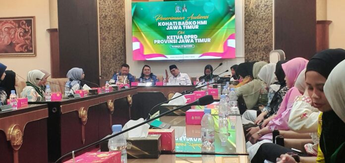 Ketua DPRD Jawa Timur, Musyafak Rouf, menerima audiensi puluhan kader Korps HMI-Wati (Kohati) Badko HMI Jawa Timur di Ruang Banmus DPRD Jatim, Senin (27/4/2026). Pertemuan ini menjadi forum penting untuk menyuarakan berbagai isu strategis terkait peran dan kapasitas perempuan dalam politik.