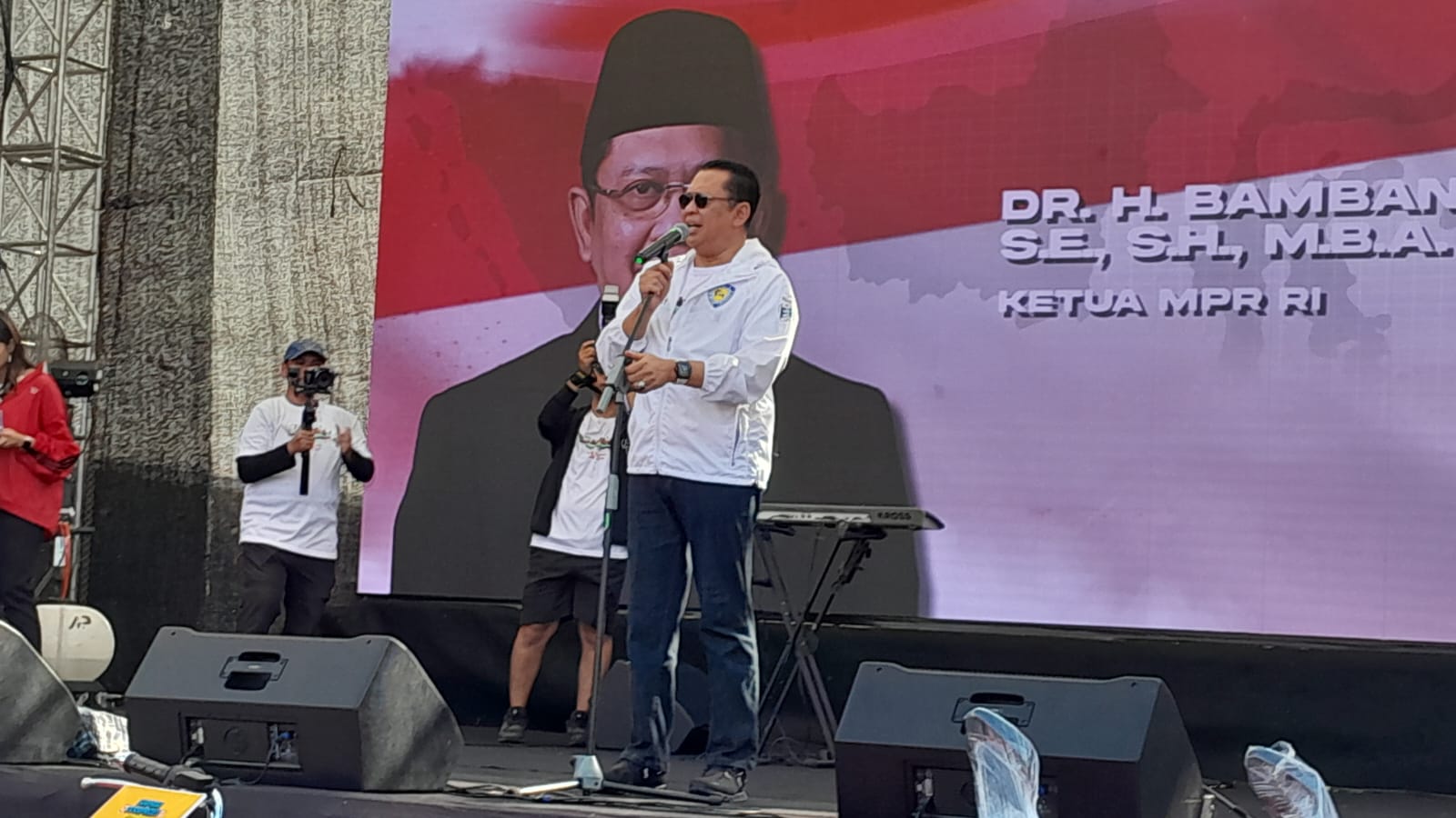 Ketua MPR RI Bamsoet saat memberikan sambutan di fun walk 3 km dan fun run 5 km HUT Ke-79 MPR RI, Kompleks Parlemen Jakarta, Sabtu (31/8).