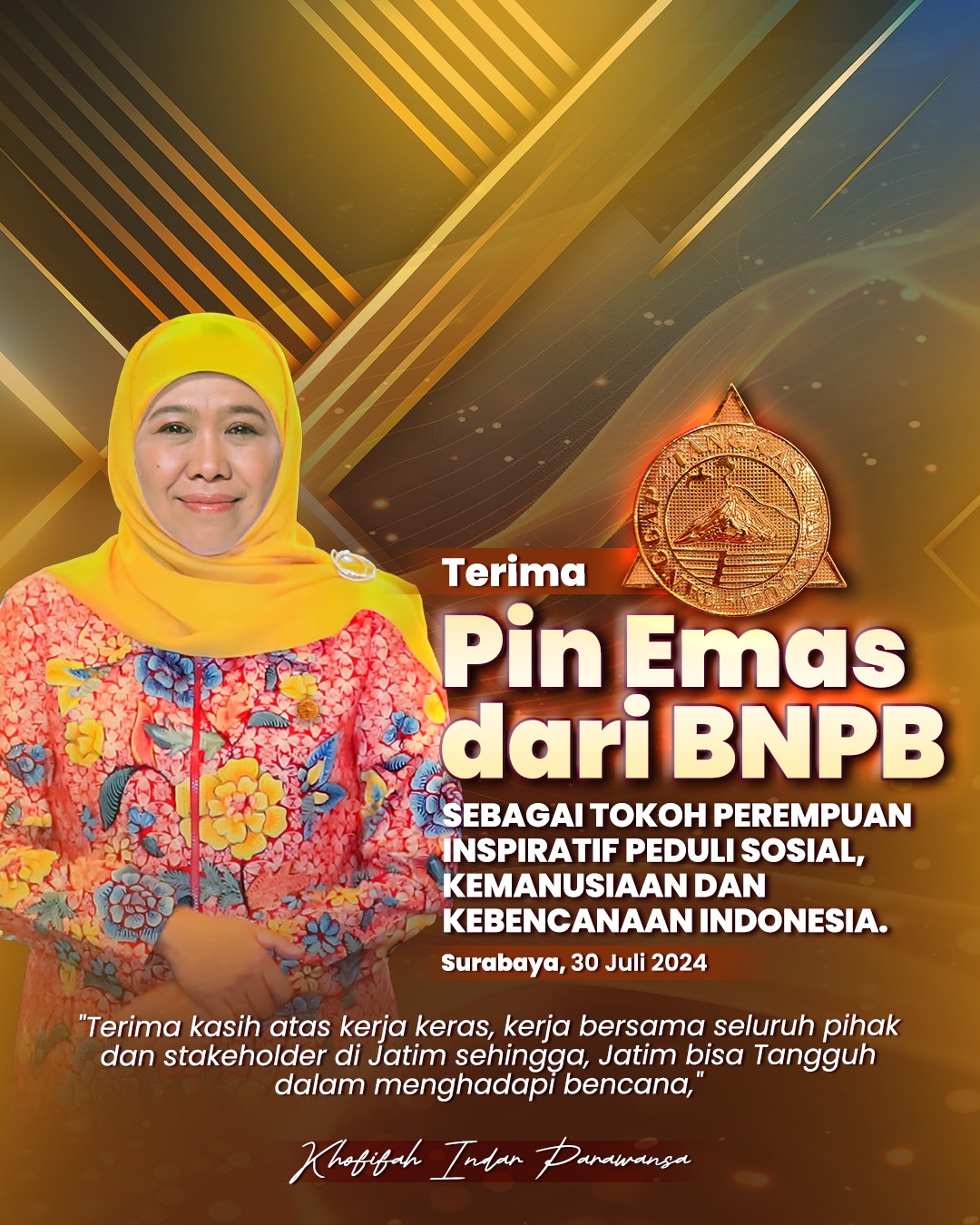 Khofifah Terima Pin Emas dari BNPB, Dinobatkan sebagai Tokoh Perempuan Inspiratif Peduli Sosial, Kemanusiaan dan Kebencanaan Indonesia