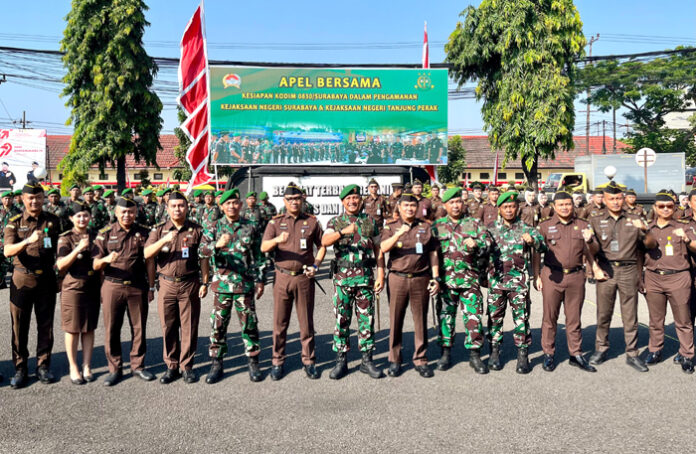 “Apel bersama ini, kita akan menjalin kerja sama dalam rangka pengamanan penugasan di Kejaksaan Negeri Surabaya dan Kejaksaan Negeri Tanjung Perak. Kami berupaya menciptakan suasana kerja yang nyaman, sehingga dari unsur Kejaksaan bisa melaksanakan tugas dengan baik,” kata Kolonel Inf Didin Nasruddin Darsono.