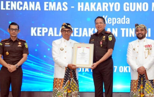 Prestasi ini menjadi alasan bagi Pemkot untuk menganugerahkan Lencana Emas Hakaryo Guno Mamayu Bawono kepada Kepala Kejaksaan Tinggi (Kajati) Jawa Timur, Dr Kuntadi SH MH.