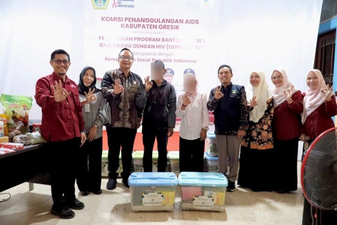 Wakil Bupati Gresik Asluchul Alif menyerahkan bantuan langsung tahap pertama bagi Orang Dengan HIV (ODHIV), Kamis (26/02/26). Bertempat di Kantor Komisi Penanggulangan AIDS (KPA) Gresik, kegiatan ini bekerjasama dengan Kementerian Sosial Republik Indonesia.