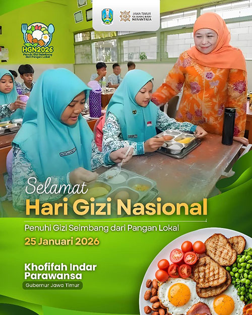 Memperingati Hari Gizi Nasional (HGN) Tahun 2026, Gubernur Jawa Timur, Khofifah Indar Parawansa menegaskan komitmen Pemerintah Provinsi Jawa Timur dalam memperkuat pembangunan gizi masyarakat.