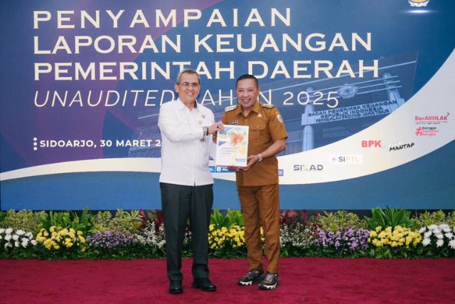 Bupati Sampang H. Slamet Junaidi menyerahkan Laporan Keuangan Pemerintah Daerah (LKPD) Unaudited Tahun Anggaran 2025 kepada Badan Pemeriksa Keuangan (BPK) Perwakilan Provinsi Jawa Timur di Gedung BPK Perwakilan Provinsi Jawa Timur, Sidoarjo, Senin (30/3/26).