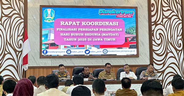Peringatan May Day tanggal 1 Mei besok dipastikan bakal berjalan aman dan kondusif. Pemerintah Jawa Timur dalam hal ini Dinas Tenaga Kerja dan Transmigrasi (Disnakertrans) Jawa Timur telah menggelar rapat koordinasi finalisasi persiapan peringatan May Day 2025 pada Senin (28/4) di Ruang Wawasan, Disnakertrans Jatim.