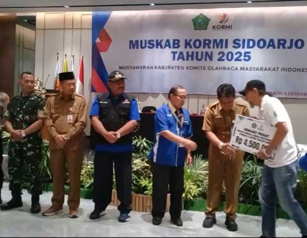KORMI Sidoarjo, Selasa (9/12) kemarin, mencairkan bonus bagi atlet peraih medali, saat bertanding di Festival Olahraga Masyarakat Nasional (FORNAS) ke VIII tahun 2025, di Nusa Tenggara Barat.