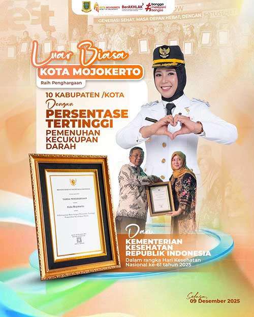 Kota Mojokerto kembali mengukir prestasi di ujung tahun 2025 ini, yakni masuk jajaran 10 besar daerah dengan persentase tertinggi pemenuhan kecukupan darah secara nasional.