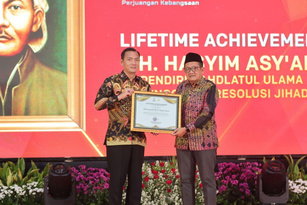 Ketua KPI Pusat, Ubaidillah saat menyerahkan penghargaan Lifetime Achievement untuk Hadratussyaikh KH. M. Hasyim Asy’ari sebagai inspirator siaran perjuangan pada peristiwa 10 November 1945 pada Malam Puncak Anugerah KPID Jatim, Selasa malam (12/11).