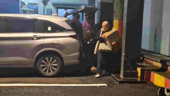 Petugas KPK membawa kardus saat tiba di Mapolres Tulungagung, Jumat (10/4/2026) malam.